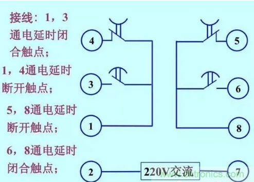 6-8腳為通電延時(shí)斷開(kāi)觸點(diǎn),接通電源,給了信號(hào)之后線(xiàn)圈得電,等到設(shè)置時(shí)間到達(dá)以后,觸點(diǎn)斷開(kāi);