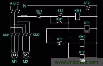 各個(gè)引腳的含義我們已經(jīng)搞清楚了,下面就可以根據(jù)控制原因進(jìn)行接線(xiàn),我們以下圖為例,在電路中加入KT通電延時(shí)時(shí)間繼電器,當(dāng)按下啟動(dòng)按鈕SB2線(xiàn)圈KT1、KM1得電交流接觸器KM1吸合,電動(dòng)機(jī)M1轉(zhuǎn)動(dòng),延時(shí)閉合開(kāi)關(guān)KT1到達(dá)時(shí)間吸合,KM2、KT2得電,交流接觸器KM2得電吸合,電動(dòng)機(jī)M2轉(zhuǎn)動(dòng),延時(shí)斷開(kāi)開(kāi)關(guān)KT2在到達(dá)時(shí)間以后斷開(kāi),整個(gè)控制回路斷開(kāi),所有電機(jī)停止轉(zhuǎn)動(dòng);