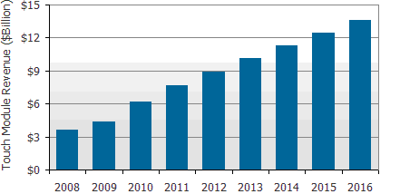根據DisplaySearch最新出版2010觸控面板市場分析報告指出2009年全球觸控面板產值達43億美元,估計2016年將成長到140億美元,年復合成長率達18%。