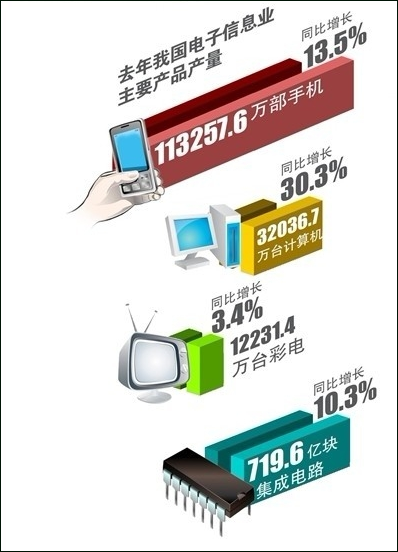 近日,工信部發(fā)布《2011年電子信息產(chǎn)業(yè)統(tǒng)計(jì)公報(bào)》,在2011年,我國彩電、手機(jī)、計(jì)算機(jī)等主要電子產(chǎn)品產(chǎn)量占全球出貨量的比重分別達(dá)到48.8%、70.6%和90.6%,均名列世界第一。