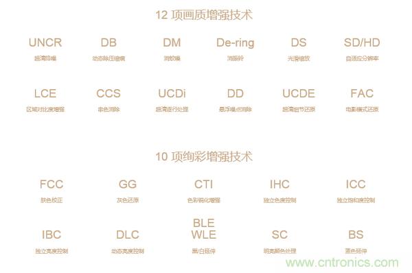 當然,它也關畫質有那么一點事。因為大部分的電視ARM芯片也都集成了畫質引擎技術,比如下圖所出現的,有百分之九十的人都不會看完的各種高大上的技術術語。不要以為這些技術很牛,是電視廠商搞出的什么新鮮玩意兒,其實這只是一個多合一芯片集成了所有的接口,也就是說只要是同一芯片方案的電視機連底層程序都是一樣的,沒有絲毫的獨特性。