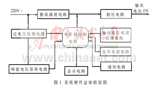 系統(tǒng)硬件框架如圖1所示。在正常的情況下,220V的交流輸入電壓經(jīng)過整流、濾波、DC/DC變換、穩(wěn)壓電路后可得到一個穩(wěn)定的輸出電壓,基本上是一個開關(guān)電源;當(dāng)有過電壓時,過電壓信號經(jīng)過過電壓檢測電路檢測和峰值電壓保持電路保持,控制電源回路,斷開正常工作的交流電路,同時通過計算機(jī)啟動備用電源工作,以及完成對過電壓的瞬時值和峰值的測量。
