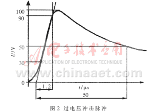 過電壓對于電源來說是一個非常有害的信號,雷電等引起的瞬時高電壓如果不加遏制,直接由電源引入RTU(遠(yuǎn)程終端設(shè)備)則會影響其電源模塊的正常工作,使各功能模塊的工作電壓升高而工作不正常,嚴(yán)重時會損壞模塊,燒壞元器件(IC)。典型過電壓形成的沖擊電壓脈沖如圖2所示。