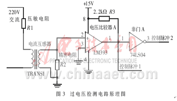 過電壓檢測電路原理圖如圖3所示。當(dāng)有過電壓信號產(chǎn)生時,壓敏電阻被擊穿,呈現(xiàn)低阻值甚至接近短路狀態(tài),這樣在電流互感器的原級產(chǎn)生一個大電流,通過線圈互感作用在副級產(chǎn)生一個小電流,再通過精密電阻把電流信號轉(zhuǎn)變?yōu)殡妷盒盘枺贿@個信號輸入到電壓比較器LM393后,電壓比較器LM393輸出高電平,經(jīng)過非門A輸出的控制脈沖1控制電源回路,斷開開關(guān)電源電路,啟動備用電源。控制脈沖2 送到單片機(jī)的中斷口,單片機(jī)控制回路啟動A/D轉(zhuǎn)換,采樣過電壓的瞬時值。