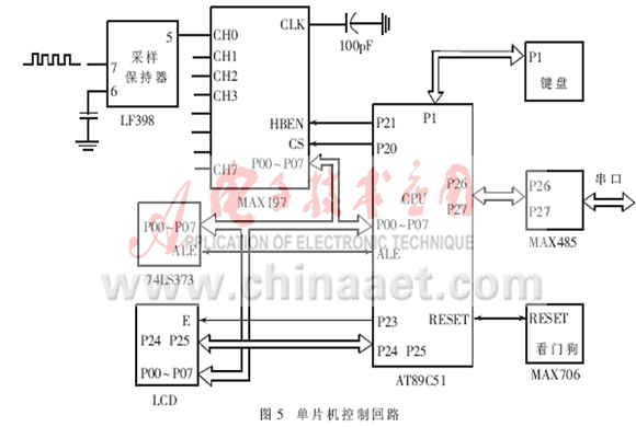 單片機(jī)控制回路如圖5所示。它的主要功能是完成對過電壓的瞬時值和峰值的檢測、過電壓次數(shù)的檢測、電源輸出電壓和電流的檢測,并通過鍵盤的操作顯示出各個檢測值的大小;同時通過485接口和上位機(jī)實(shí)現(xiàn)通訊,在有過電壓的時候通過控制回路啟動備用電源,實(shí)現(xiàn)對電源本身的保護(hù)。