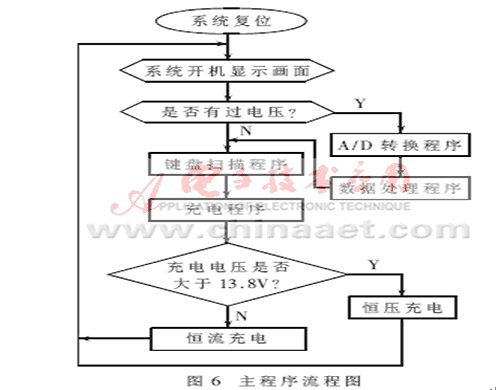 主程序由初始化、看門狗置位、鍵盤掃描子程序、中斷子程序組成。主程序主要進(jìn)行分配內(nèi)存單元、設(shè)置串行口等器件的工作方式和參數(shù),為系統(tǒng)正常工作創(chuàng)造條件。在主程序運(yùn)行的過程中,通過按鍵可以顯示檢測的各個量的值;同時在系統(tǒng)有過電壓和干擾信號產(chǎn)生時,液晶顯示屏?xí)@示提示信息,使電源實(shí)現(xiàn)“透明”,便于電源的管理。在本系統(tǒng)中,鍵盤采用的是由P1口組成的3×3行列矩陣式鍵盤。由于鍵盤程序的技術(shù)已經(jīng)相當(dāng)成熟,所以具體過程不做介紹。