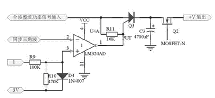 圖5所示的電路中,延時(shí)比較開關(guān)由運(yùn)算放大器U4A組成。同步三角波輸入到運(yùn)算放大器U4A的反相輸入端,差壓比較兼積分濾波電路的輸出電壓加到運(yùn)算放大器U4A的同相輸入端進(jìn)行比較、整形。