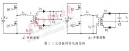 用兩個元件組成的諧振拓樸結構主要有兩種:并聯結構和串聯結構,分別如圖1(a)和圖1(b)所示。串聯諧振在輕負載時具有較高的效率,而在滿負載時轉換效率比較低;并聯諧振則反之,在滿負載時具有較高的轉換效率,而在輕負載時轉換效率比較低。而且串聯諧振和并聯諧振都要求較寬的頻率范圍。因此,這種二元的諧振網絡在實際應用中都有一定的限制。