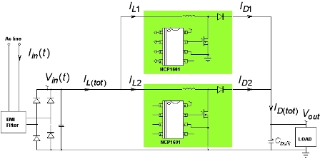 兩個DCM PFC就像一個CCM PFC轉(zhuǎn)換器,簡化電磁干擾(EMI)濾波,并減小輸入電流有效值