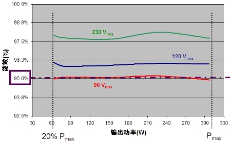 對基于安森美半導(dǎo)體NCP1601交錯式PFC方案的寬輸入范圍、300 W PFC預(yù)轉(zhuǎn)換器進(jìn)行的測試顯示,這解決方案在很寬的負(fù)載范圍內(nèi)(從20%到100%)、90 Vrms電壓條件下實現(xiàn)95%的能效,如圖2所示。