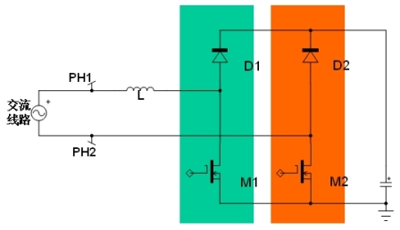 圖3:傳統(tǒng)的無橋PFC結(jié)構(gòu)示意圖。