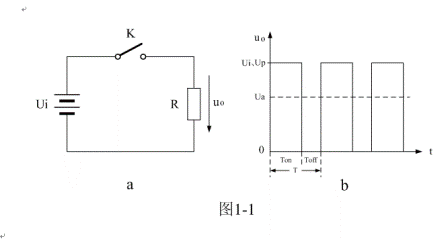 圖1-1-a是串聯式開關電源的最簡單工作原理圖,圖1-1-a中Ui是開關電源的工作電壓,即:直流輸入電壓;K是控制開關,R是負載。當控制開關K接通的時候,開關電源就向負載R輸出一個脈沖寬度為Ton,幅度為Ui的脈沖電壓Up;當控制開關K關斷的時候,又相當于開關電源向負載R輸出一個脈沖寬度為Toff,幅度為0的脈沖電壓。這樣,控制開關K不停地“接通”和“關斷”,在負載兩端就可以得到一個脈沖調制的輸出電壓uo 。