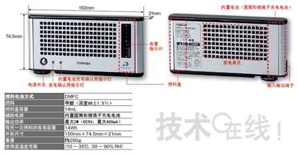 東芝已上市的外置燃料電池能為可用USB充電的便攜產品充電。1mL燃料能發電1Wh,充一次燃料能發電約14Wh。