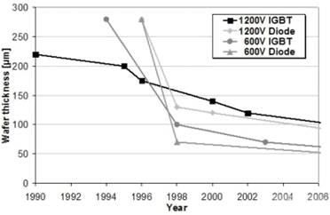 由于導(dǎo)通電壓和關(guān)斷損耗在很大程度上取決于晶圓的厚度,因此需要做更薄的IGBT。圖4顯示了英飛凌600/1,200VIGBT和EMCON二極管的晶圓厚度趨勢。對于新型1,200VRC-IGBT而言,120um厚度晶圓將是標(biāo)準(zhǔn)工藝。這需要進(jìn)行復(fù)雜的晶圓處理,包括用于正面和背面的特殊處理設(shè)備。將晶圓變薄可通過晶圓打磨和濕式化學(xué)蝕刻工藝實(shí)現(xiàn)。