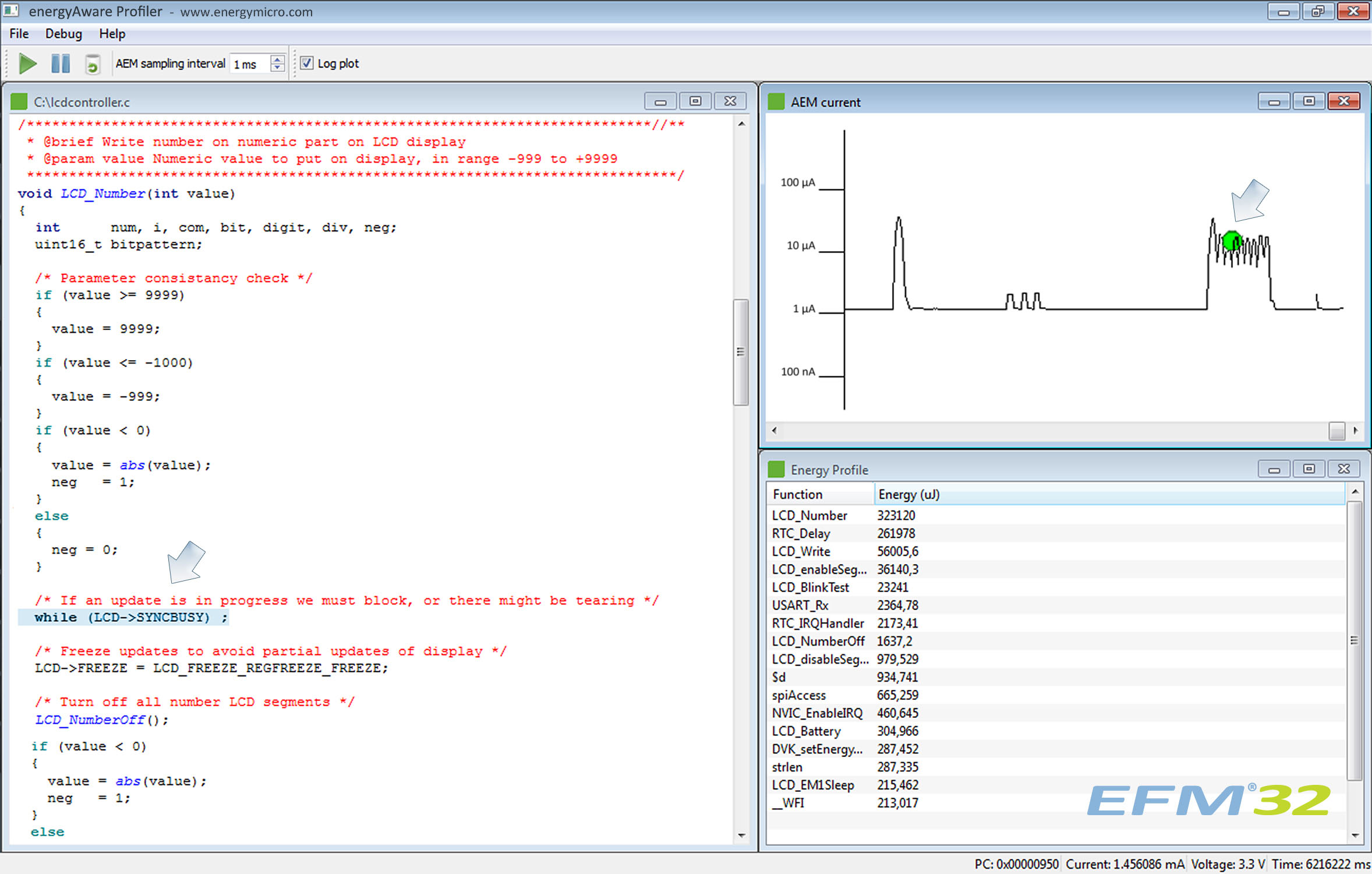 為EFM32 Gecko MCU開發的energyAware Profiler技術有一個從0.1μA至100mA的動態范圍,應用的精細調試與功能調試同時進行,從而將開發時間的結果最大化了。