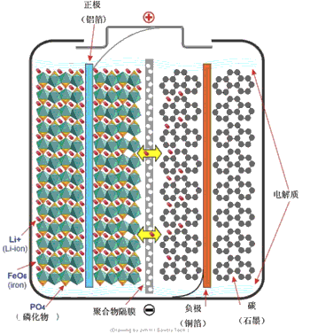 LiFePO4電池在充電時(shí),正極中的鋰離子Li+通過聚合物隔膜向負(fù)極遷移;在放電過程中,負(fù)極中的鋰離子Li+通過隔膜向正極遷移。鋰離子電池就是因鋰離子在充放電時(shí)來回遷移而命名的。