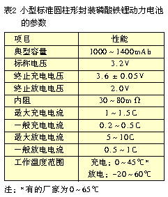 磷酸鐵鋰動(dòng)力電池的容量有較大差別,可以分成三類:小型的零點(diǎn)幾到幾毫安時(shí)、中型的幾十毫安時(shí)、大型的幾百毫安時(shí)。不同類型電池的同類參數(shù)也有一些差異。這里再介紹一種目前應(yīng)用較廣的小型標(biāo)準(zhǔn)圓柱形封裝的磷酸鐵鋰動(dòng)力電池的參數(shù)。其外廓尺寸:直徑為18mm、高650mm(型號為18650),其參數(shù)性能如表2所示。