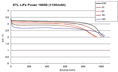 一種型號為STL18650的磷酸鐵鋰動(dòng)力電池(容量為1100mAh)在不同的放電率時(shí)其放電特性如圖2所示。最小的放電率為0.5C,最大的放電率為10C,五種不同的放電率形成一組放電曲線。由圖2中可看出,不管哪一種放電率,其放電過程中電壓是很平坦的(即放電電壓平穩(wěn),基本保持不變),只有快到終止放電電壓時(shí),曲線才向下彎曲(放電量達(dá)到800mAh以后才出現(xiàn)向下彎曲)。在0.5~10C的放電率范圍內(nèi),輸出電壓大部分在2.7~3.2V范圍內(nèi)變化。這說明該電池有很好的放電特性。