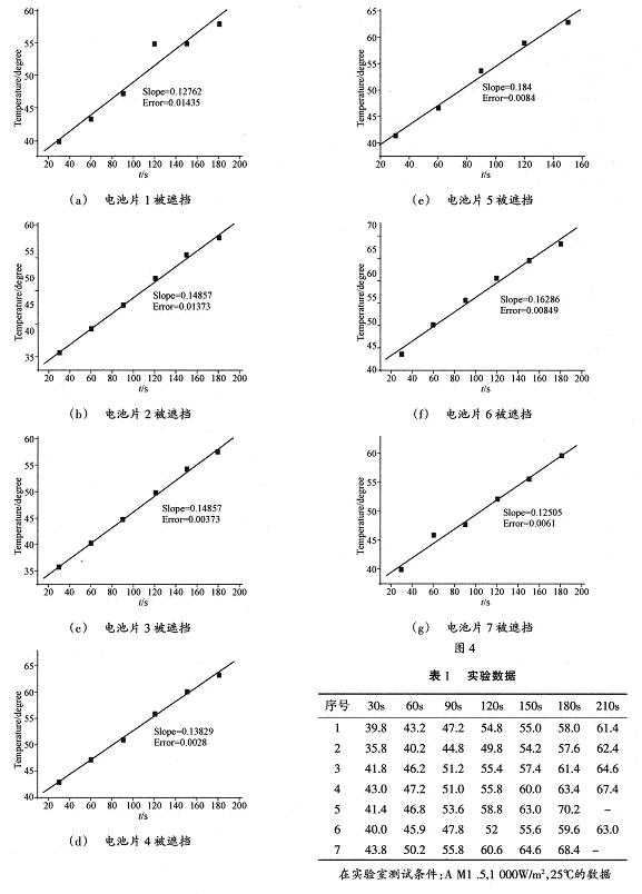 為了驗(yàn)證遮擋造成的溫度變化,我們?cè)趯?shí)驗(yàn)室進(jìn)行了測(cè)試來加以驗(yàn)證。如圖3(a)~圖3(g)所示,是在實(shí)驗(yàn)室模擬陽光照射,對(duì)一塊多晶硅太陽電池組件隨機(jī)挑選7塊硅片遮蓋所作的升溫實(shí)驗(yàn)曲線圖表,用Origin7.0軟件進(jìn)行的擬合: