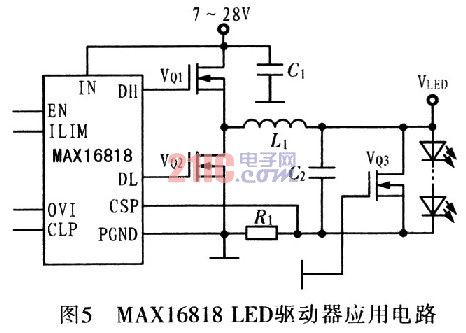 需要較高照明功率的場合,如泛光燈或霧燈,必須使用超高亮度LED(HBLED)。HBLED需要較高的驅動電流,前面討論的產品無法提供低成本設計,需要過多的驅動器產生所需的電流。最好采用能驅動大電流功率管的控制器,大電流功率管可以為HBLED提供高達30A的電流,MAXl6818可以滿足這種設計要求,如圖5所示。