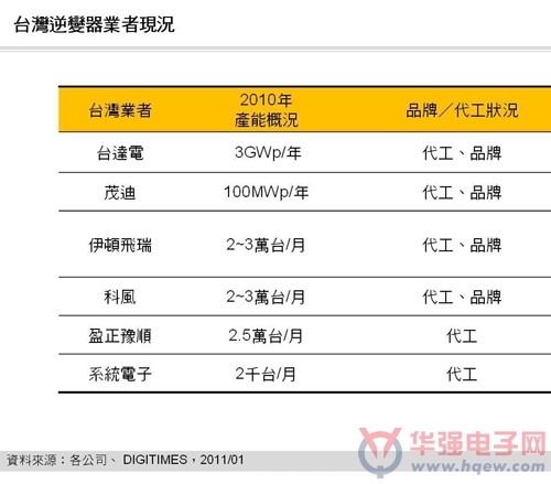 DIGITIMES Research指出,目前臺廠逆變器均獲得多數(shù)國家并網(wǎng)認證,產品品質有相當水準。然而,太陽能逆變器的缺貨狀況在2010年第3季告一段落,因此,2010年第4季兩岸業(yè)者的出貨量明顯下滑。當全球知名太陽能逆變器業(yè)者于2010年以2、3倍甚至更高的速度擴充產能,加上上游零組件缺料疑慮解除,太陽能逆變器供給缺口得以補足時,兩岸業(yè)者能否持續(xù)獲得訂單,成為市場一大疑慮。