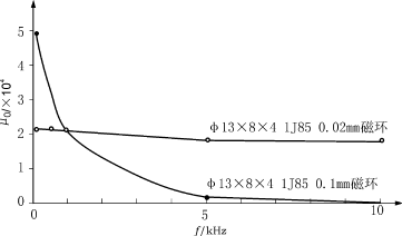 共模電感是完全對(duì)稱、線圈匝數(shù)相同的兩個(gè)電感線圈,繞在同一個(gè)鐵心上,電流同方向流經(jīng)兩組線圈后,根據(jù)右手螺旋法則,在電感鐵心內(nèi)產(chǎn)生兩個(gè)方向相反的磁場(chǎng),由于流經(jīng)電流大小,線圈匝數(shù)完全相同,磁場(chǎng)強(qiáng)度強(qiáng)弱相當(dāng),因而完全抵消,不存在磁飽和問(wèn)題,主要是要考慮電感鐵心材料的初始磁導(dǎo)率μo,對(duì)于這類材料的μo越高越好,通常有高μo系列的鐵氧體磁心,μo=4×103,6×103,8×103,1×104等類型,鐵基超微晶材料μo≥5×104,坡莫合金系列如1J79,1J851系列,μo≥5×104。在選擇金屬磁性材料時(shí)必須注意頻響問(wèn)題(見(jiàn)圖3)1J79或1J851系列的磁心μo隨頻率上升而下降的幅度比較大,越薄的材料,μo隨頻率下降的幅度比較小,設(shè)計(jì)時(shí)應(yīng)注意這一點(diǎn)。