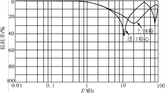但是值得商榷的是,可選擇作為濾波器的差模電感的磁粉心不僅僅是μe=75鐵粉心一種,圖5是鐵粉心系列μe=75,μe=55,μe=35磁導(dǎo)率隨頻率變化的曲線,可見(jiàn)它們磁導(dǎo)率隨頻率上升而下降的趨勢(shì)不同。圖6是MICROMETARS公司-8(μe=35)和上海鋼研精密合金器材研究所SF-33(μe=37.5)鐵粉心材料的插入損耗曲線,可見(jiàn)吸收峰出現(xiàn)在不同的頻率范圍內(nèi),因此除了考慮電感量大小,磁飽和問(wèn)題,價(jià)格等因素外,還應(yīng)該考慮抑制噪聲的頻率范圍,來(lái)選擇不同型號(hào)的鐵粉心。