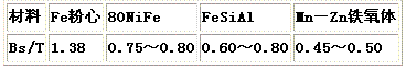 目前扼流圈鐵心使用的材料主要有兩類,一類是功率鐵氧體磁心加開(kāi)氣隙,另一類是磁粉心。表1是它們的飽和磁感應(yīng)強(qiáng)度(Bs)的比較,其中錳鋅軟磁鐵氧體Bs值最低,為0.5T,約為鐵粉心的一半左右,因此在同樣安匝數(shù)下和鐵粉心相比截面將增加1倍左右,因而體積勢(shì)必增大。