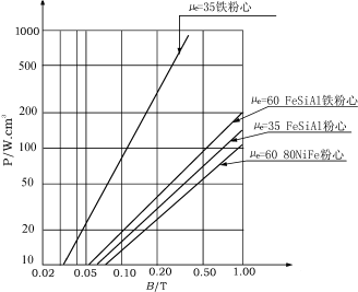 關(guān)于磁粉心在PFC電感中的應(yīng)用,已被很多電源工作者所認(rèn)可。目前磁粉心材料大致有鐵粉心,Sendust粉心(FeSiAl),坡莫合金粉心(P.P.M),從損耗曲線上可以看出,P.P.M(μe=60)及Sendust(μe=60)和鐵粉心(μe=35)相比,前二者約為后者的1/10~1/6,因此,鐵粉心可以排除,無(wú)法用作PFC電感材料,除非大大增加體積,降低工作B值。