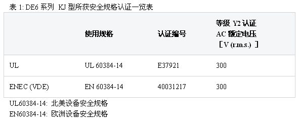 要想獲得安全規格認證,需要接受規定的實驗并滿足要求標準,通過合格判定,才能夠證明電容器符合該規格。但目前,對On-Board(含車載充電器的車載設備)的安全規格并無明確規定。實際上,車載充電器已經參照現有民用設備的安全規格,決定了其規格發展方向并付諸實施。因此,該電容器在遵循現有的設備安全規格(IEC 60384-4)的基礎上,也獲得了各國的安全規格認證。DE6系列“KJ”型所獲得的安全規格認證如下表1所示。