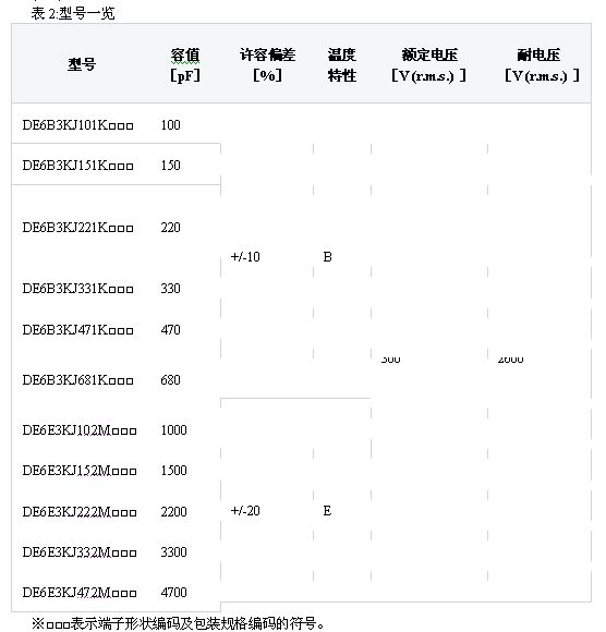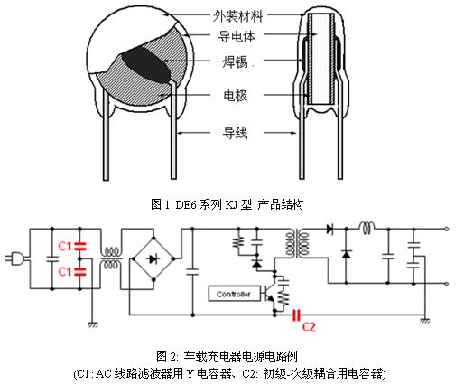 產品線如表2所示,產品結構如圖1所示。產品的容值從100pF到4700pF,另外,額定電壓為AC300V (r.m.s.) 、耐電壓為AC2600V (r.m.s.) /60sec。滿足IEC 60384-14所規定的實驗條件,通過新樹脂材料的絕緣涂裝,提高了耐溫度循環特性,能夠成為PHEV以及EV的車載充電器的AC線路濾波器用Y電容器、初級次級耦合用電容器,如圖2所示。