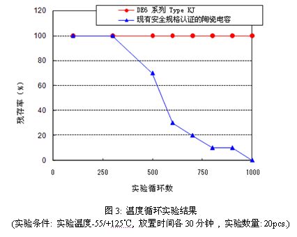 現有安全規格認證的陶瓷電容器在溫度循環實驗等反復進行溫度變化的條件下,因電容器構成材料熱膨脹率的散差,容易引起外部涂裝樹脂的結合力降低,從而導致外部涂裝樹脂出現裂縫,嚴重時會由于內部陶瓷元器件的裂縫,造成容值及絕緣耐壓值的降低。所以,原樣采用現有結構材料將難以用于車載設備。因此,為提高耐溫度循環性,通過選定具備可塑性的新型樹脂材料,就能夠制做出確保溫度循環1000周期、符合安全規格認證的陶瓷電容器。溫度循環實驗下的產品特性比較情況如圖3所示。