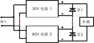 220V交流電壓經(jīng)整流和濾波后得到320V左右的直流電壓,加至電源模塊輸入端。單DC-DC模塊的最高輸出電壓一般為+48V,要得到+60V的直流輸出電壓,必須采用模塊串聯(lián)的方法得到。設(shè)計采用兩塊PH600S280-28 DC-DC模塊(調(diào)至+30V輸出),通過串聯(lián)得到+60V的輸出電壓,如圖1所示。
