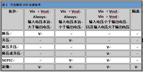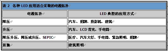 如同表2所示,LED已廣泛運(yùn)用于各領(lǐng)域,因此需要許多種類的電源拓?fù)洌С諰ED的應(yīng)用。一般而言,必須考慮輸入電壓、輸出電壓及對隔離的需求,以做出適當(dāng)選擇。