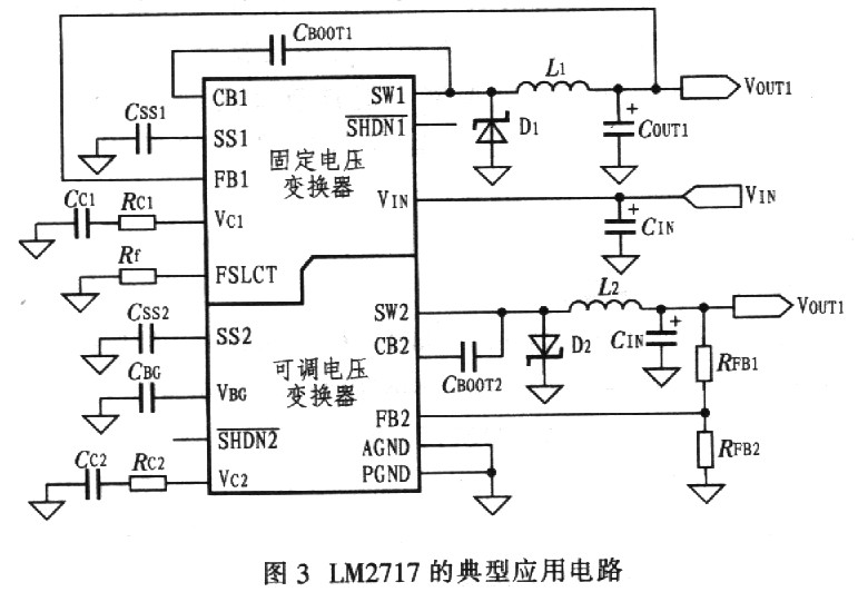圖3所示是LM2717的典型應用電路。圖中,VIN是整個應用電路的電壓輸入端,VOUT1是固定降壓變換器的電壓輸出端,VOUT2是可調降壓變換器的電壓輸出端。CIN、Coot、CSS、CBOOT、L分別是輸入電容器、輸出電容器、軟啟動電容器、自舉電容器、電感,這幾個元件在設計時應著重考慮。這里主要介紹利用該電路進行設計時一些主要外元件的選擇原則及需注意的問題。