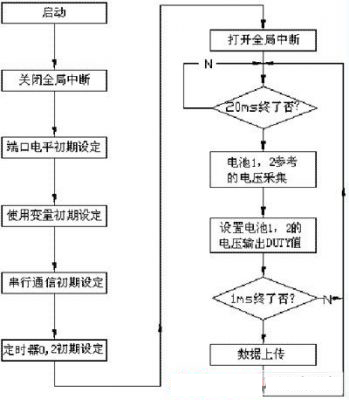 為了驗(yàn)證本文的均衡充電方法,以兩節(jié)單體電池組成的蓄電池組為例進(jìn)行實(shí)驗(yàn)和分析,主要驗(yàn)證旁路中開關(guān)管對(duì)電壓的調(diào)節(jié)作用??刂屏鞒桃妶D4。