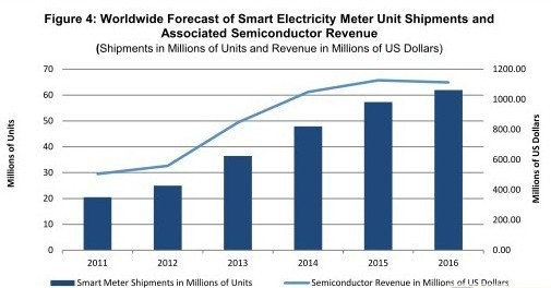 由于具有節能和改善電網效率的優點,預計電力企業將迅速采用智能電表,推動2011-2016年全球出貨量增長兩倍,并帶動相關的半導體市場擴大一倍。