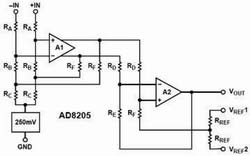 AD8205的內(nèi)部電路由A1和A2兩個集成運(yùn)放和一個電阻網(wǎng)絡(luò),以及一個小參考電壓源和偏置電路構(gòu)成,其電路結(jié)構(gòu)如圖1所示。