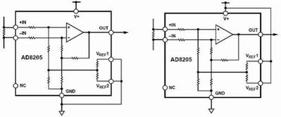 雙極性輸出時AD8205可以測量流過采樣電阻上的雙向電流,這時,輸出可以偏置到輸出范圍內(nèi)的任意位置。當(dāng)被檢測的正反兩個方向上的電流為等幅時,其輸出必須偏置到滿量程輸出的中間位置。當(dāng)雙向電流幅值不對稱時,輸出偏置可以對應(yīng)地偏離半量程位置。它的兩個參考輸入VREF1和VREF2分別連接一個內(nèi)部電阻RREF后接到同一個內(nèi)部偏置節(jié)點,這兩個參考輸入端的操作方式完全相同。在兩個參考電壓輸入端接入對應(yīng)的電壓,即可完成對輸出的偏置。在雙極性輸出方式下,一般有以下兩種連接方式。