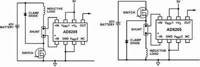 如圖4(b)所示連接,PWM開關(guān)和采樣電阻都位于電壓高側(cè)。當(dāng)PWM開關(guān)打開時,負(fù)載電源將被移除,但仍然可以提供和監(jiān)測續(xù)流電流,以實現(xiàn)電流控制診斷。在工作過程中,大部分時間電源都和負(fù)載隔離,這樣可將負(fù)載對地之間的差分電壓所引起的不良影響減到最小。當(dāng)PWM開關(guān)閉合時,電源電壓將連接到負(fù)載,這時共模電壓將增加到電源電壓。而PWM開關(guān)打開時,電壓將反轉(zhuǎn)并經(jīng)過感性負(fù)載,由于續(xù)流二極管的作用,使得采樣電阻上的共模電壓保持為一個低于地的二極管的導(dǎo)通壓降。