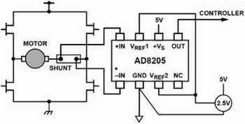 如圖5所示連接,AD8205在H橋馬達(dá)控制電路中作為控制回路的一部分,馬達(dá)和采樣電阻串連后放置在H橋的中間,通過檢測采樣電阻上的電壓,可以準(zhǔn)確地測量馬達(dá)當(dāng)前的電流及其方向。此時,AD8205的輸出被設(shè)定成外部參考雙向的方式,這樣它可以測量H橋開關(guān)的雙向電流并同時監(jiān)測馬達(dá)的運(yùn)轉(zhuǎn)方向。由于地不是一個特別穩(wěn)定的參考電平,以地為參考將會導(dǎo)致測量的不準(zhǔn)確性。因此,這種測試方案要比以地作為參考電平的測試方法好的多。