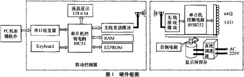 硬件系統主要有移動控制器和顯示屏兩部分組成,如圖1所示。移動控制器主要負責接收PC機端軟件取摸數據、加入控制字符并保存,還能向顯示屏發送特定控制命令、切換顯示內容、改變顯示效果。顯示屏主要有電機控制轉速和單片機控制E3jLED顯示內容等。