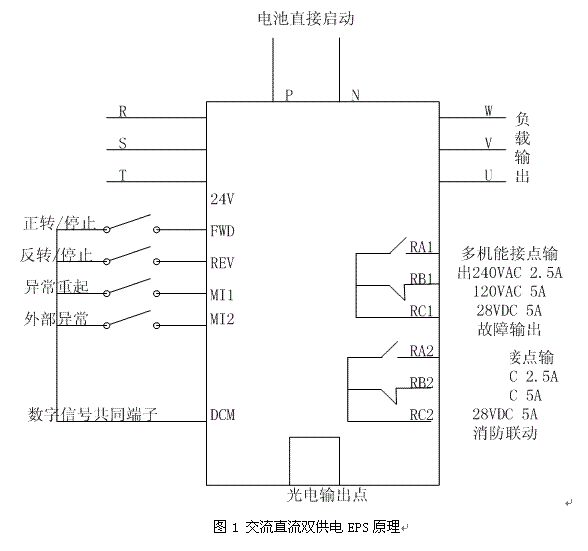 目前EPS采用的控制方式和控制手段不同,針對EPS所帶的負載可以歸納三種:一是主要用于應急照明和事故照明的EPS;二是除了應急照明、事故照明之外,還有應用于空調(diào)、電梯、卷簾門、排氣風機、水泵等混合負載的三相系列EPS;三是直接給電動機供電的變頻系列EPS。本文介紹的是最全面的混合負載三相系列EPS供電。