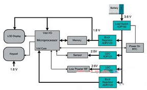 便攜式系統(tǒng)包含優(yōu)化半導(dǎo)體工藝和工作電壓要求的多個(gè)集成電路。便攜式應(yīng)用需要使用降壓調(diào)節(jié)器來調(diào)節(jié)IC采用比電池更低的工作電壓?jiǎn)栴}。當(dāng)今最常用的調(diào)節(jié)器是低壓差(LDO)和降壓型開關(guān)調(diào)節(jié)器,如圖2所示。LDO由基準(zhǔn)電壓源、誤差放大器、分壓器和傳輸管(pass transistor)組成。低壓差調(diào)節(jié)器只需使用兩個(gè)外部電容就能用較高直流電壓產(chǎn)生較低直流電壓,十分簡(jiǎn)便。但是,當(dāng)Vin遠(yuǎn)高于Vout時(shí),未輸送到負(fù)載的功率會(huì)以熱量形式損失。LDO效率約為(Vo/Vin)×100%.LDO效率將變得低下。