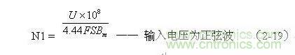 (2-19)式為計算正弦波電源變壓器初級線圈N1繞組匝數的公式。式中,N1為變壓器初級線圈N1繞組的最少匝數,S為變壓器鐵芯的導磁面積(單位:平方厘米),Bm為變壓器鐵芯的最大磁感應強度(單位:高斯),U為正弦波輸入電壓有效值,單位為伏,F為正弦波的頻率,單位赫芝。