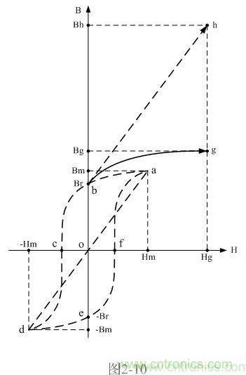 在圖2-10中,虛線表示的磁化曲線a-b-c-d-e-f-a為雙激開關變壓器鐵芯正常工作時的磁滯回線,虛線線段d-a是把開關變壓器鐵芯的磁化曲線理想化后得到的一條曲線(直線),理想磁化曲線是一條斜率等于最大磁感應強度增量與最大磁場強度增量之比,且經過坐標原點的直線;當直線不經過坐標原點時,這條直線可稱為等效磁化曲線(如線段bh)。理想磁化曲線只有一條,但等效磁化曲線卻有無數多條,且每條效磁化曲線均與理想磁化曲線平行。