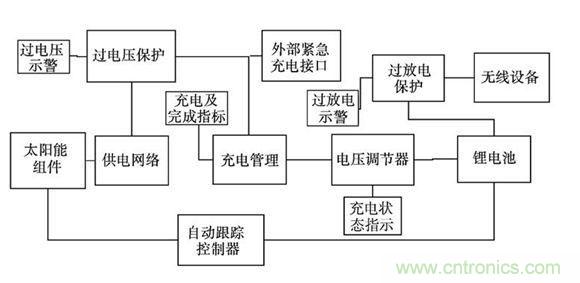 現有的光伏電池,單體的輸出電壓都很低(在1V 以下) ,本設計中,將多個光伏電池相串聯,組成太陽能組件。通過可以自動調節占空比的供電網絡保證在光照強度變化和負載變化時,輸出電壓基本穩定,為充電管理芯片提供穩定的電壓輸入。通過對供電網絡的副邊電壓監測,保護充電管理芯片不因電壓過高而損壞。通過對電池兩端的電壓監測,保證鋰電池不會因過放電而損壞。由于無線示功儀及其中繼網絡節點的供電要求是313V,采用低噪聲、高速度的CMOS型電壓調節器。在自動跟蹤控制器作用下,始終保持全天候跟蹤太陽。為了防止因連續陰雨天而導致的太陽能供電不足,設計應急充電電路,充電期間,無線示功儀及其節點正常運行。具體系統設計模塊如圖1 所示。