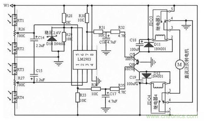 控制器的輸入端,光敏傳感器分別由兩只光敏電阻串聯交叉組合而成。每一組兩只光敏電阻中的一只為比較器的上偏置電阻,另一只為下偏置電阻。一只檢測太陽光照,另一只則檢測環境光照,送至比較器輸入端的比較電平始終為兩者光照之差。具體電路如圖4 所示:光敏電阻RT1 , RT2 與電位器R27 和光敏電阻RT3 , RT4 與電位器R28 分別構成光敏傳感電路。將RT1 和RT3 安裝在垂直遮陽板的一側, RT4 和RT2 安裝在另一側。當RT1 , RT2 , RT3 和RT4 同時受環境自然光線作用時,R27 和R28 的中心點電壓不變。當只有RT1 ,RT3 受太陽光照射, RT1 的內阻減小, LM 2903 的5 腳電位升高, 7 腳輸出高電平, 三極管Q7 導通,JDQ 4 工作,其觸點3, 5 閉合。同時RT3 內阻減小, LM 2903 的3 腳電位下降, JDQ 5 不工作,電機M 正轉;當只有RT2 , RT4受太陽光照射,同理,電機M 反轉。當轉到垂直遮陽板兩側的光照度相同時,JDQ 4, JDQ 5 都導通,電機M 才停轉。在太陽不停地偏移過程中,垂直遮陽板兩側光照度的強弱不斷地交替變化,電機不停的運動,使太陽能接收裝置始終面朝太陽。
