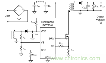 UCC28700是一款恒壓、恒流反激式控制器,無需使用光耦合器便可實現一次側穩壓。圖1是UCC28700的應用電路。