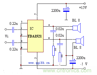 TDA1521是一款雙聲道音頻功率放大集成電路,9腳單列直插式封裝,輸出功率2×15w。性能穩定,音質也不錯,在音響應用中較為常見。 TDA1521可以在單電源或雙電源模式下工作,工作電源電壓范圍15V~40V(±7.5 -- ±20V),以下是TDA1521單電源接法和雙電源接法的電路圖: